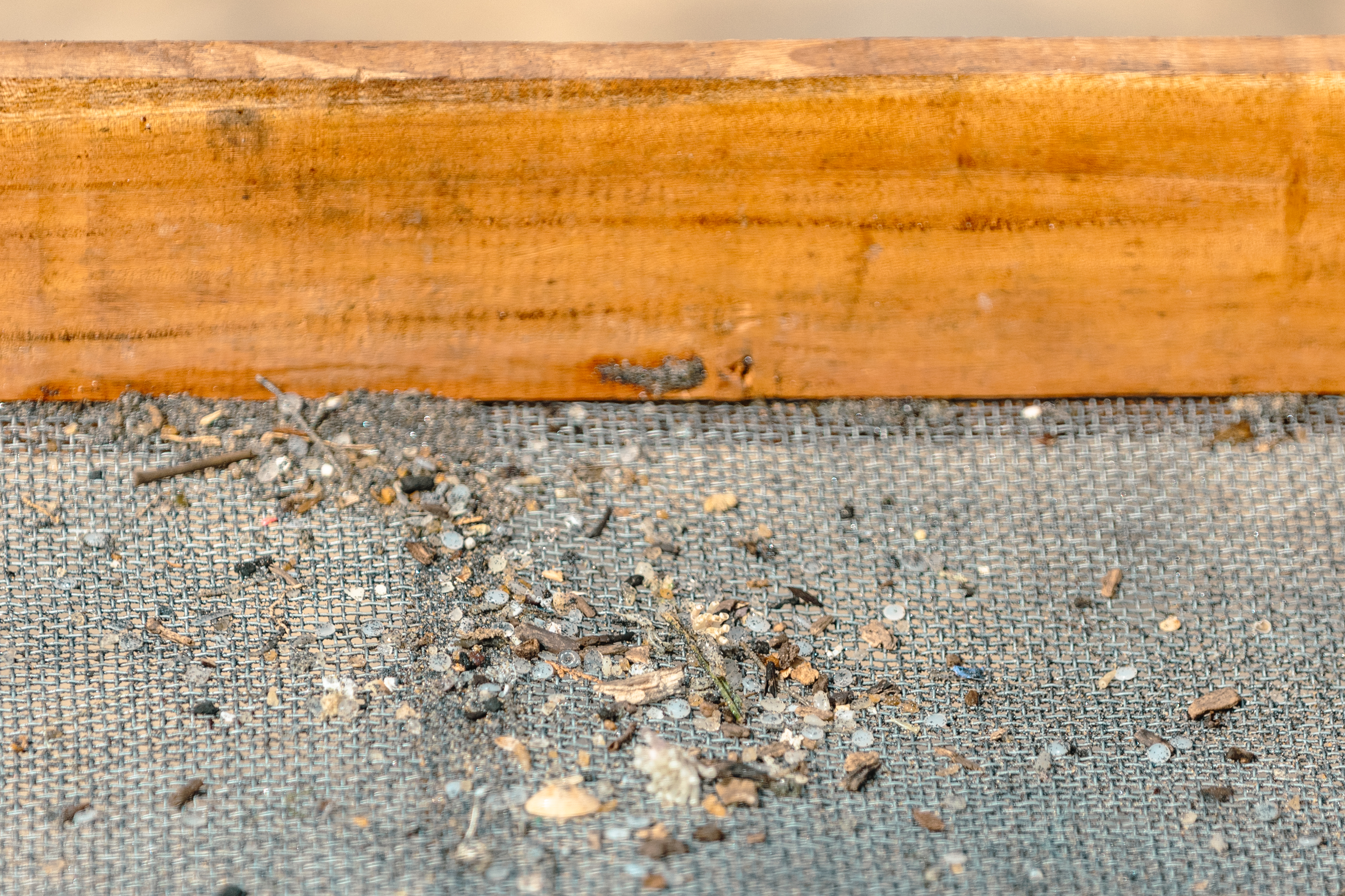 Plastic nurdles, each about the size of a lentil, are collected in a metal sieve. They are believed to have originated from the MSC Elsa shipwreck in May 2025. Photo by Nicholas Muller.