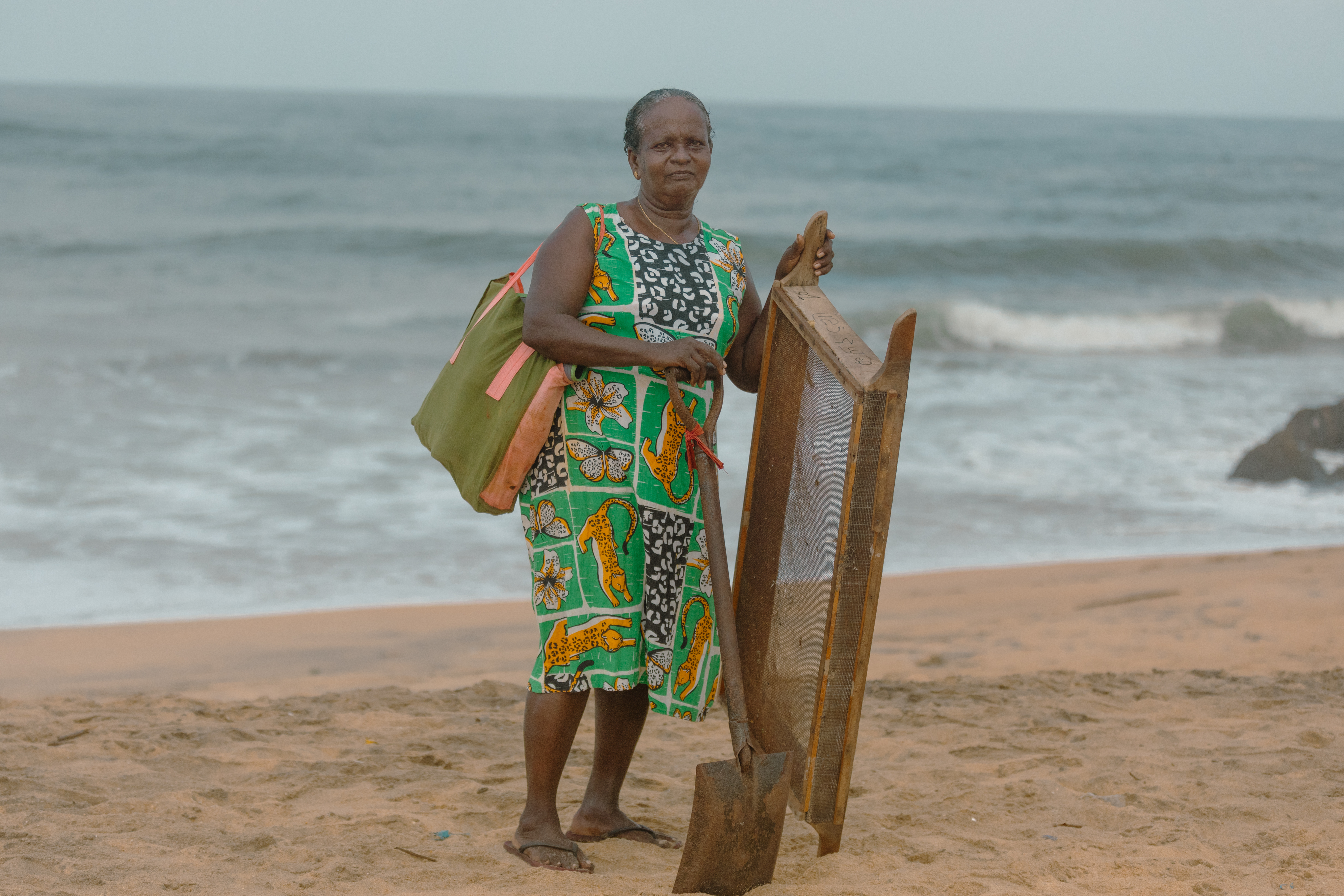 A woman from Negombo is seen with a sieve and shovel, which she uses to clean nurdles from the beach. Photo by Nicholas Muller.