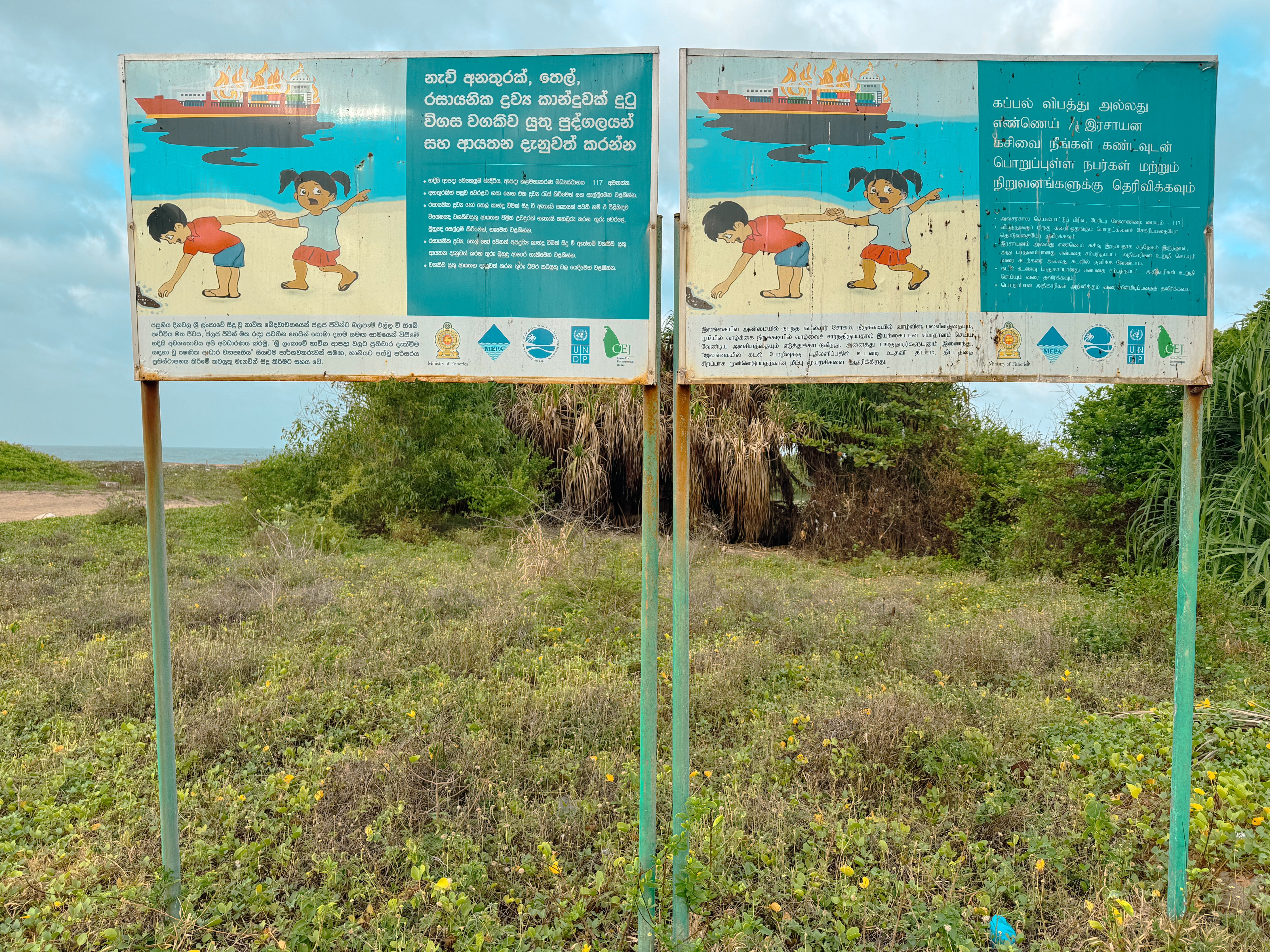 Signs in Sinhala and Tamil warn people against collecting and handling debris washed ashore on Sarakkuwa beach. Photo by Nicholas Muller.